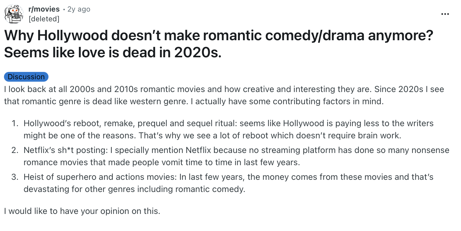 Social media is full of debates and forums questioning why romcoms have taken such a turn since the 2000s, such as the two images below from Reddit.